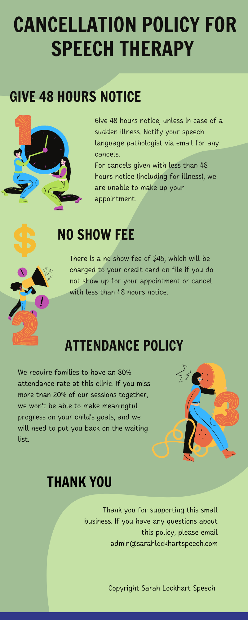 Cancelation Policy for speech therapy 1. Give 48 hours notice 2. No show and cancel fee of $45 3. 80% attendance required or you will go back on the waiting list. For questions email admin@sarahlockhartspeech.com